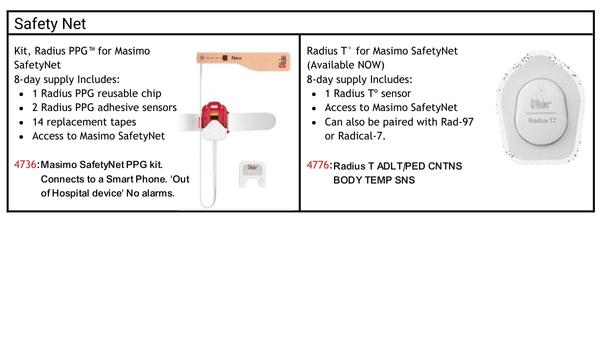 4736 | Masimo SafetyNet PPG kit. Connects to a Smart Phone. 'Out of Hospital device' No alarms. Kit, Radius PPG™ for Masimo SafetyNet (Not yet available) 8-day supply Includes: